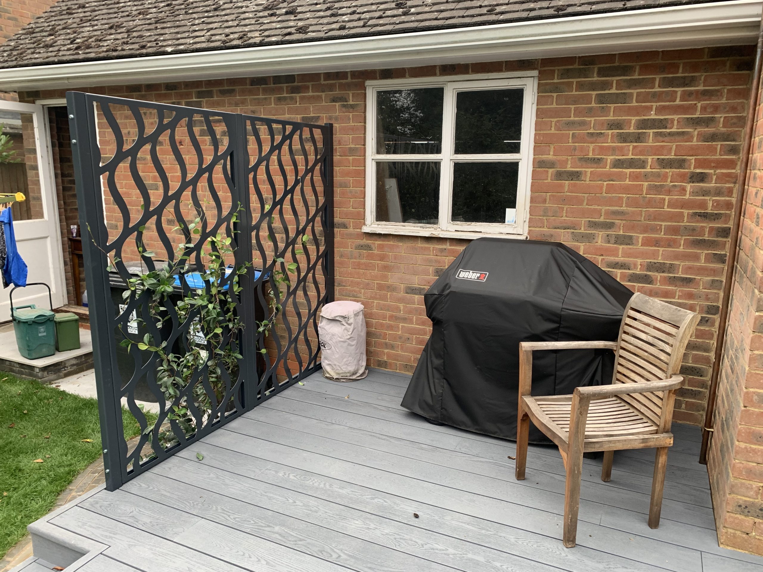A dark grey decking in a composite decking with a curved corner, new stone path and garden screens in Berkhamsted.