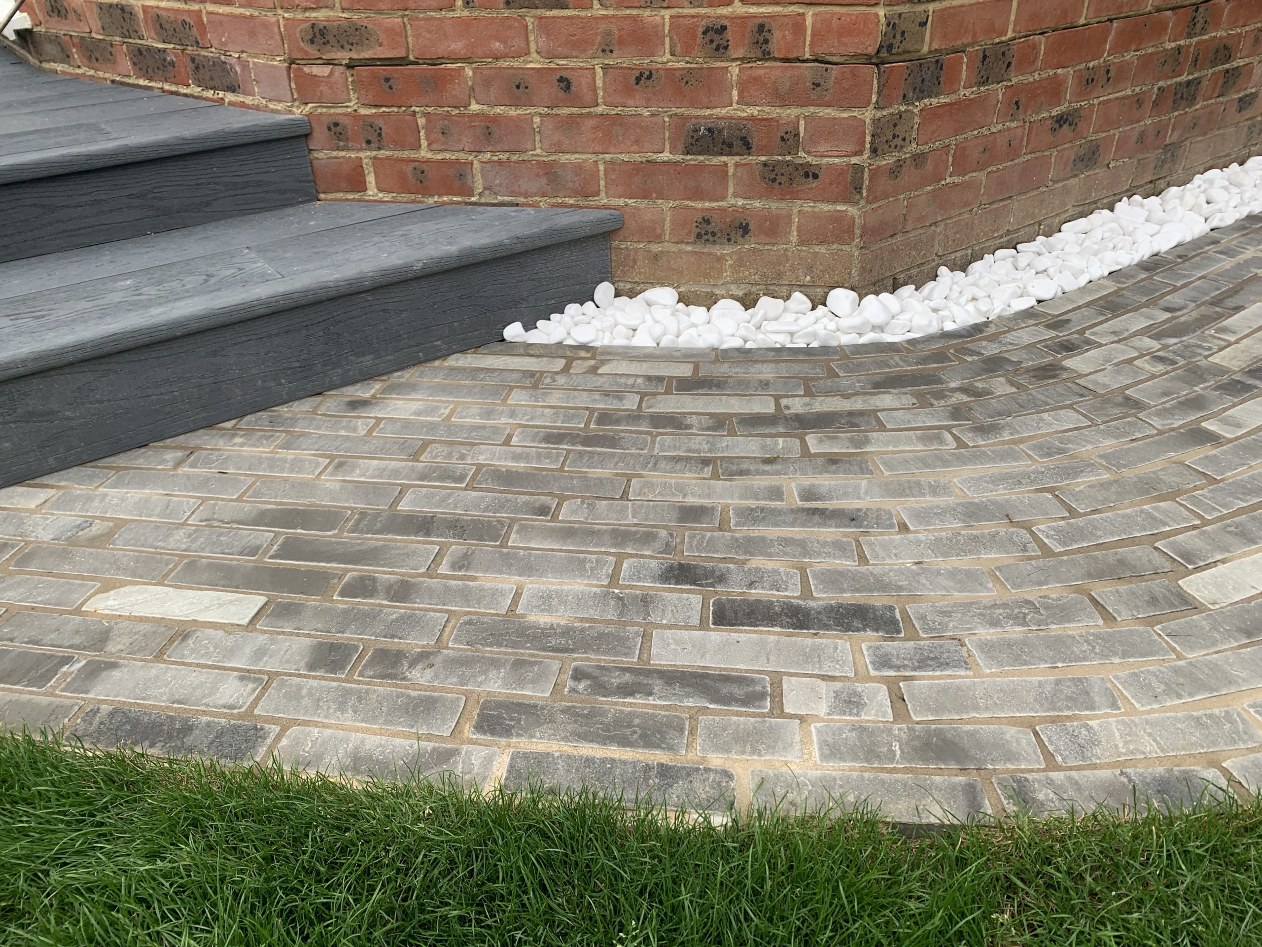 The natural stone pavers that made a simple path in Mountain Mist sawn edge contrast with the dark colour of the decking. Pointed in Steintec Tufftop jointing in a mid-grey colour.
